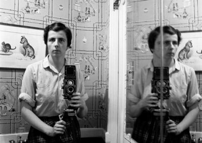 Vivian gustaba de hacerse fotografías en los reflejos de aparadores, espejos, copas en las ruedas de automóviles. Le fascinaba también dejar su propia huella y captar su sombra. Gracias a sus autorretratos sabemos cómo lucía, qué ropa usaba pero, paradójicamente “Cada autorretrato de Vivian Maier ahonda su secreto en lugar de disiparlo.”